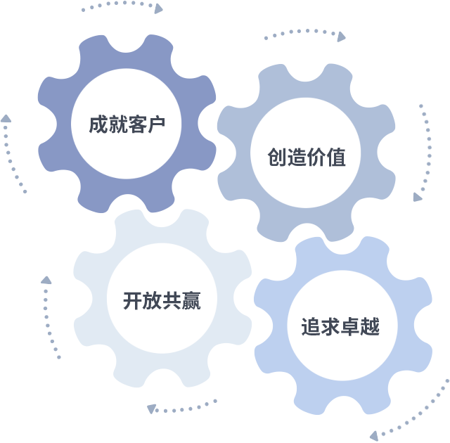 成就客户是一切决策的出发点,创造价值是衡量所有工作的标准,追求卓越是9999js金沙老品牌做事做人的态度,开放共赢是9999js金沙老品牌的格局也是最终的结果。价值观的齿轮环环相扣,推动着组织里的每个人不断向前。